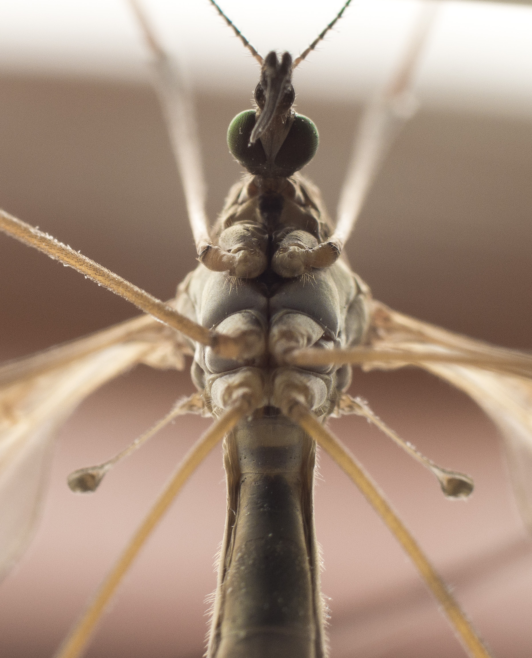 I caught this crane fly hanging around my venetian blinds and had to capture it at this angle. The insect was restless, so I had little time to fiddle with the settings to get better DoF and color. Although I'm satisfied with the sharpness of the eye and body, I wish the mouth parts and side appendages were in focus. Camera Settings: Macro extension tube used, 1/160s exposure + f/4 for sharpness, ISO 400 to compensate for low light Post processing: The insect has more muted colors as compared to the background, so I desaturated the image and adjusted colors. Cropping was also done | ||