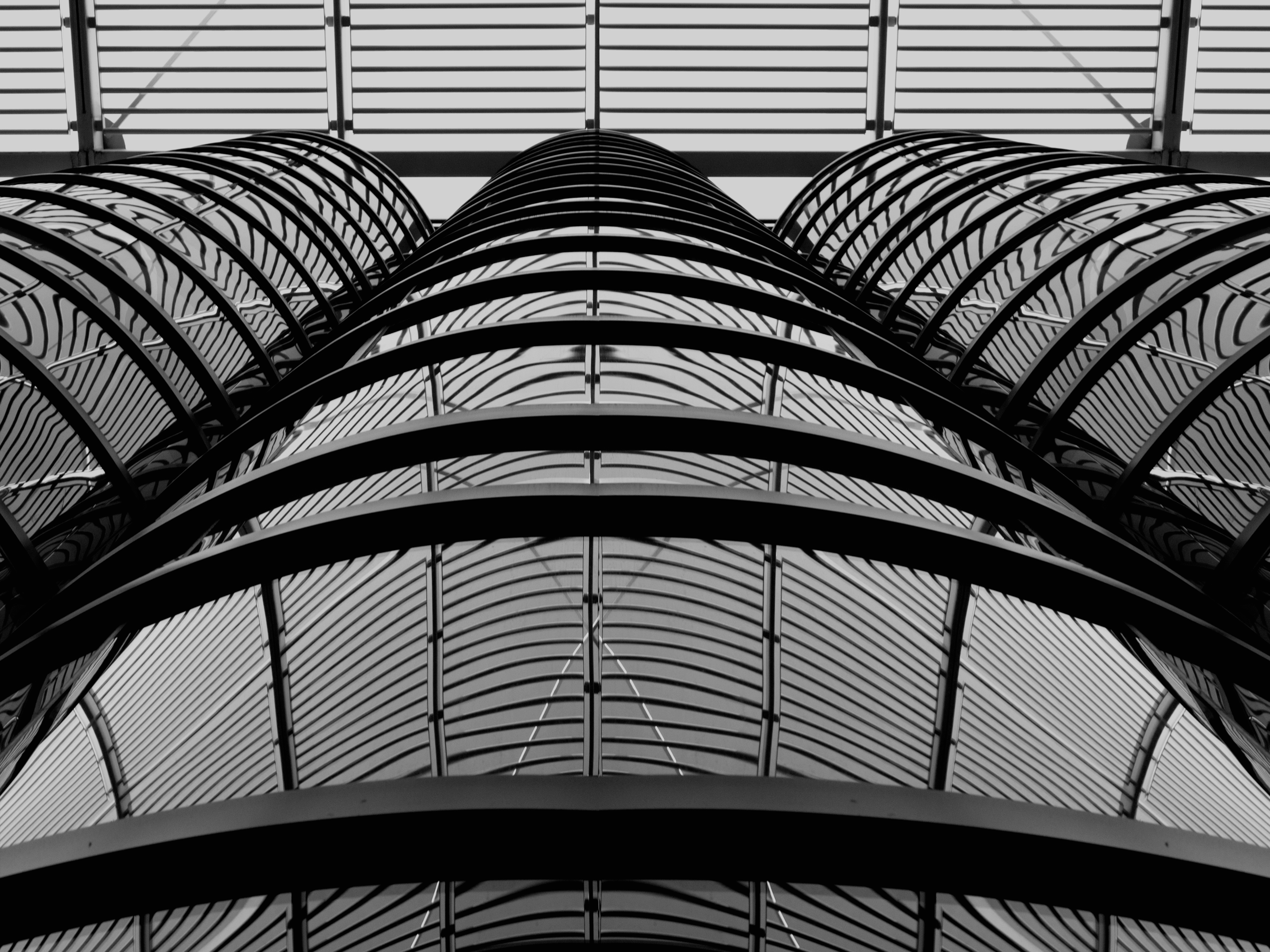 focal length: 23mm This photo meets the requirement of a vertical vanishing point. The greatest challenge in choosing the settings for this photo was finding an aperture and shutter speed to get all of the shapes in focus and get proper lighting on the bright glass and on the dark beams; in retrospect, I might have tried an even slower shutter speed to increase the brightness of the reflections. I chose these offices as a subject because I liked the way the smooth glass was transformed by the patterns it reflected and the way the glass distorted the reflections of the bars above. I used some layering in PS to improve the already strong symmetry of the picture, to crop the picture, and to apply a B&W filter to create even greater emphasis on the shapes and lines of the picture. | ||