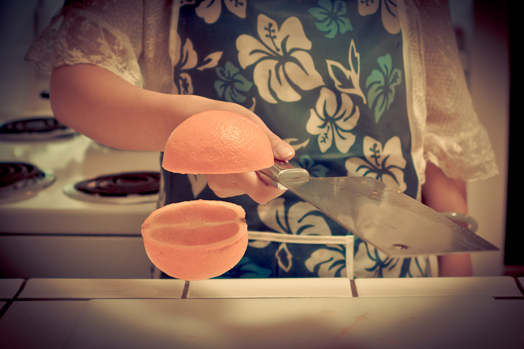 This is a picture of my girlfriend slicing an orange in mid air. 2 shots were used to create this effect. First, I took a picture of my girlfriend holding the knife, and then I took a picture of the oranges in the same background. I used a pair of chopsticks to hold them up, since using my fingers would cast a shadow on the oranges. I then cut out the two halves of the orange in photoshop, and merged it onto the original image.This is a picture of my girlfriend slicing an orange in mid air. 2 shots were used to create this effect. First, I took a picture of my girlfriend holding the knife, and then I took a picture of the oranges in the same background. I used a pair of chopsticks to hold them up, since using my fingers would cast a shadow on the oranges. I then cut out the two halves of the orange in photoshop, and merged it onto the original image. I'm pretty bad at photoshop, so this is a really amateur attempt at levitation. The hardest part of this was making the shadow of the oranges look realistic. To make it less obvious that I had edited the image, I applied a retro filter to even out the colors. I also applied vignetting to draw attention to the orange. The lighting for this shot came from the kitchen lights, which was obviously from above. I think it worked out well for this shot. | ||