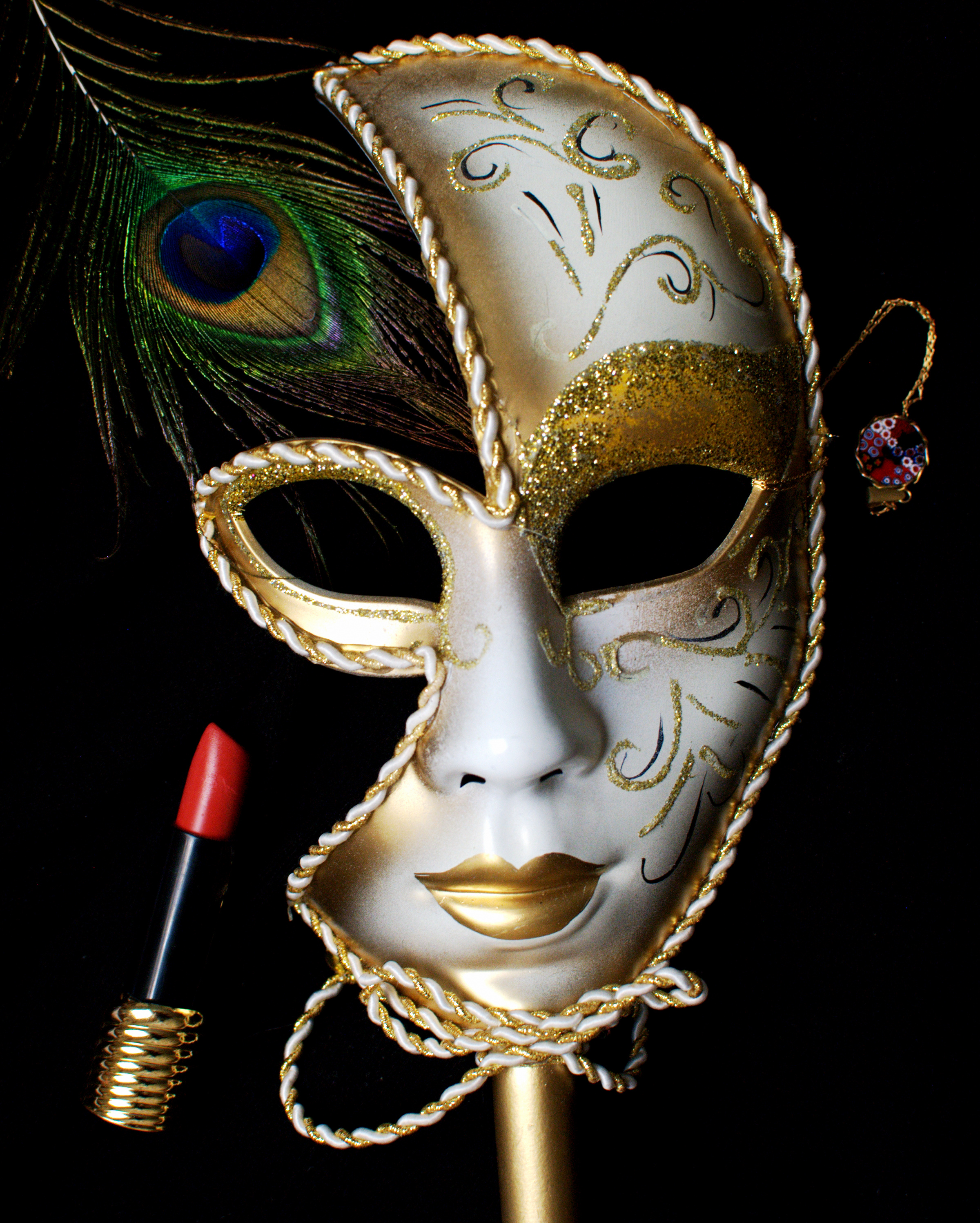 For this shot, I placed some objects that related to the theme of vanity on a black background (I used a black jacket). The lighting was overhead - this was done on a bed under a covered skylight window. Hence the natural light that came through was diffused through skylight covering, giving the scene a nice, soft glow. I wanted the light distribution to be equal, so all the objects would be emphasized, which is why I chose a bird's-eye view shot. I used a black background because I thought it would add good contrast to all of my objects. I tried arranging the items around the mask, since the mask was so large. For image processing, I used a combination of brightening, boosting, and the "Orton" filter in Picasa to bring out the colors and the blackness of the background. | ||
