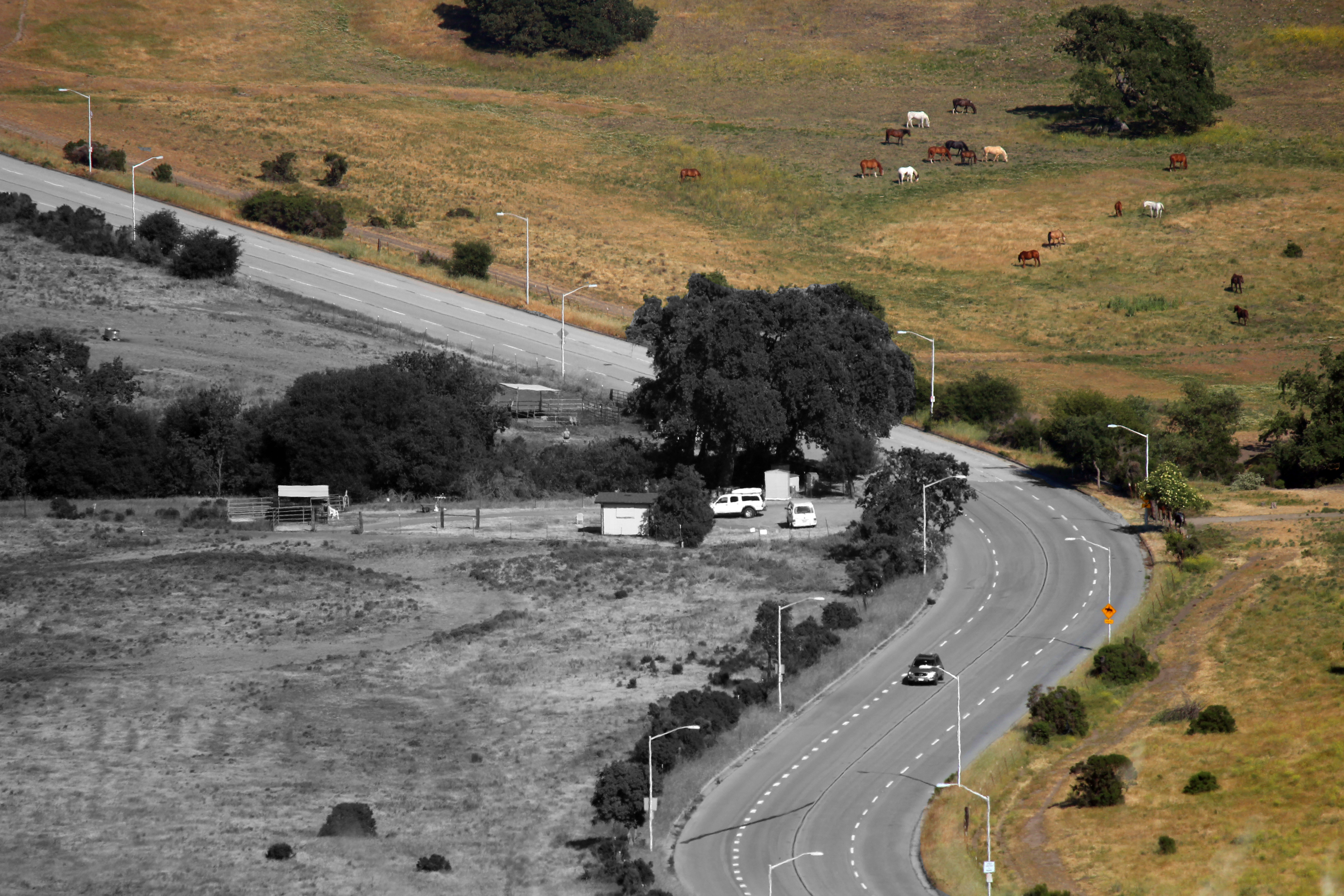 I took this while hiking the dish because I was attracted to the relatively 'colorful' cows that contrasted with the grey boring road. In order to highlight this, I decided to created a separate black and white layer on top of the original and I erased the right side to produce this effect. I also globally edited the tone and contrast using auto tone and auto contrast to make the picture clearer. Since it was a bright day, ISO was 100. My aperture was f/5.6 as I zoomed in (focal length 200mm) quite a fair bit to get this shot. Shutter speed was 1/800sec so it was perfectly fine that I handheld it. | ||