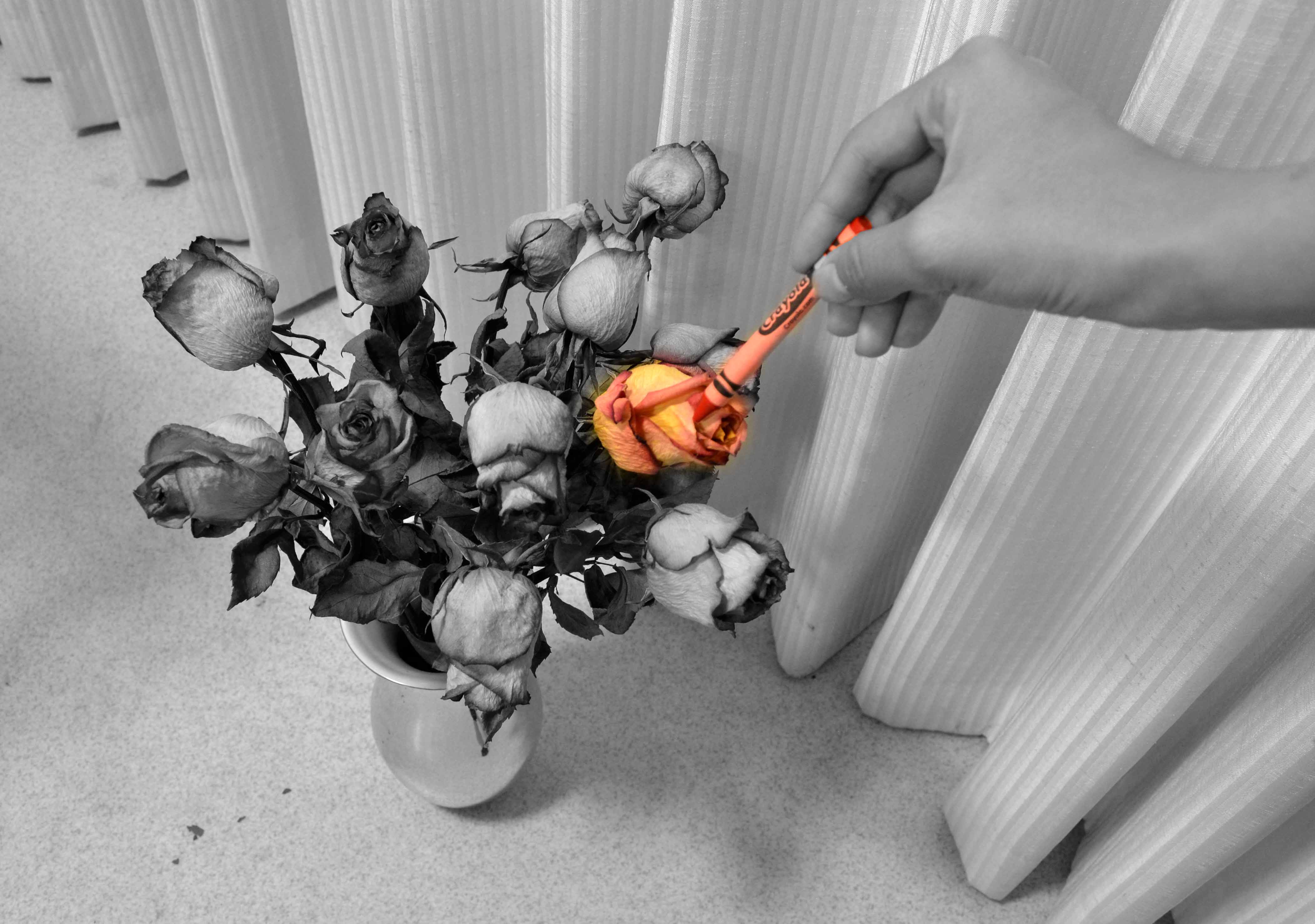 In this picture, I try to paint a dried rose with red crayon. I did some post-processing using a layer mask in Photoshop. The ISO is 800. The exposure time is 1/2 sec and the F number is 8. All the objects in the picture is grayed except the painted rose and the pen. | ||