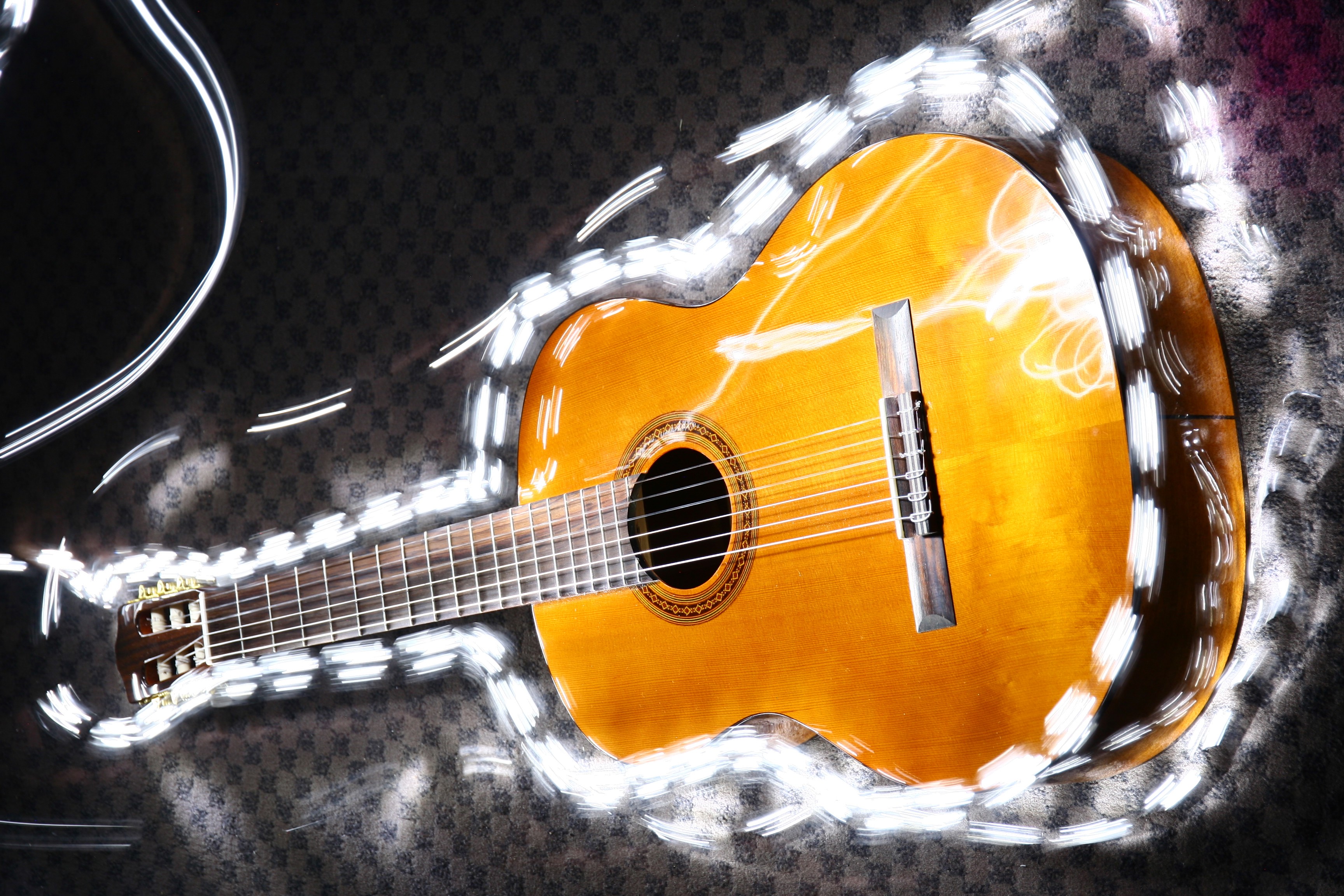 I find this requirement quite enjoyable but very hard to get a good shoot. I had a picture in my mind what I wanted the picture to be. But after I tried to draw floating note figures above the guitar many many times, I finally changed my plan and turned to draw a dash outline around my guitar for instead. Of course, it's still not an easy task! First of all, I focus the guitar and then switch my lens to manual focus in order to lock the focus. Using ISO100, I set exposure to be 30 seconds and set f-number accordingly. I drew an outline using a bicycle light in flashing mode to create dash lines. I also lighted up the guitar at the end. | ||