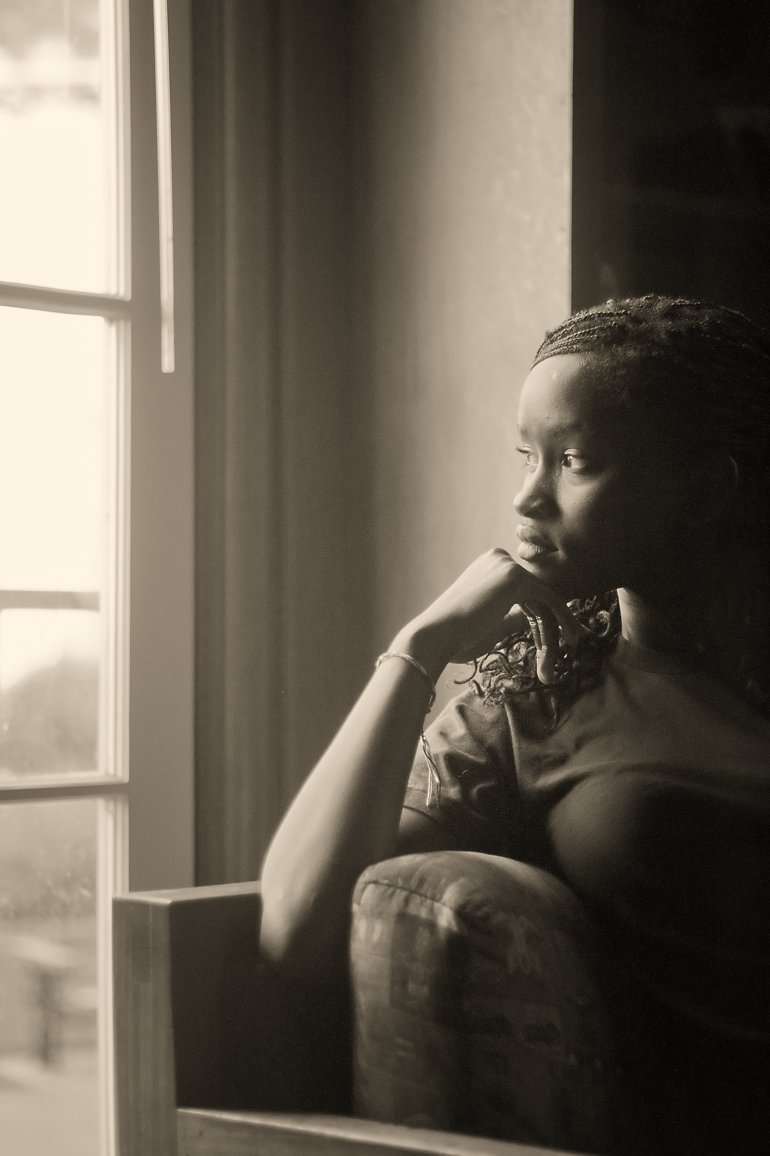 I took this image at one of the study/hang out rooms at Bechtel house. I was a bit unsure what I was going to use for my lighting because it was really dark in this room. So the furniture was arranged nicely however, and there was a nice couch that was getting a lot of light. My subject sat down and I took a couple of pictures. I ended up taking like 10 pictures and I think this one was my favorite because of the natural light coming in from the window, and because it was almost sunset, the sunlight wasn't too harsh. I like that her face is well defined, and that the outside window peeks into the outside for the viewer to see what the subject is looking at. I wish there was a bit more of the outside, but getting a right frame composition was hard already with all the surrounding stuff hanging from the walls. I took this with an ISO 1600, which means I had to do some Noise Reduction and an f/1.8 using a 50mm lens. In photoshop I just made it black and white and cropped from the top a little bit. | ||