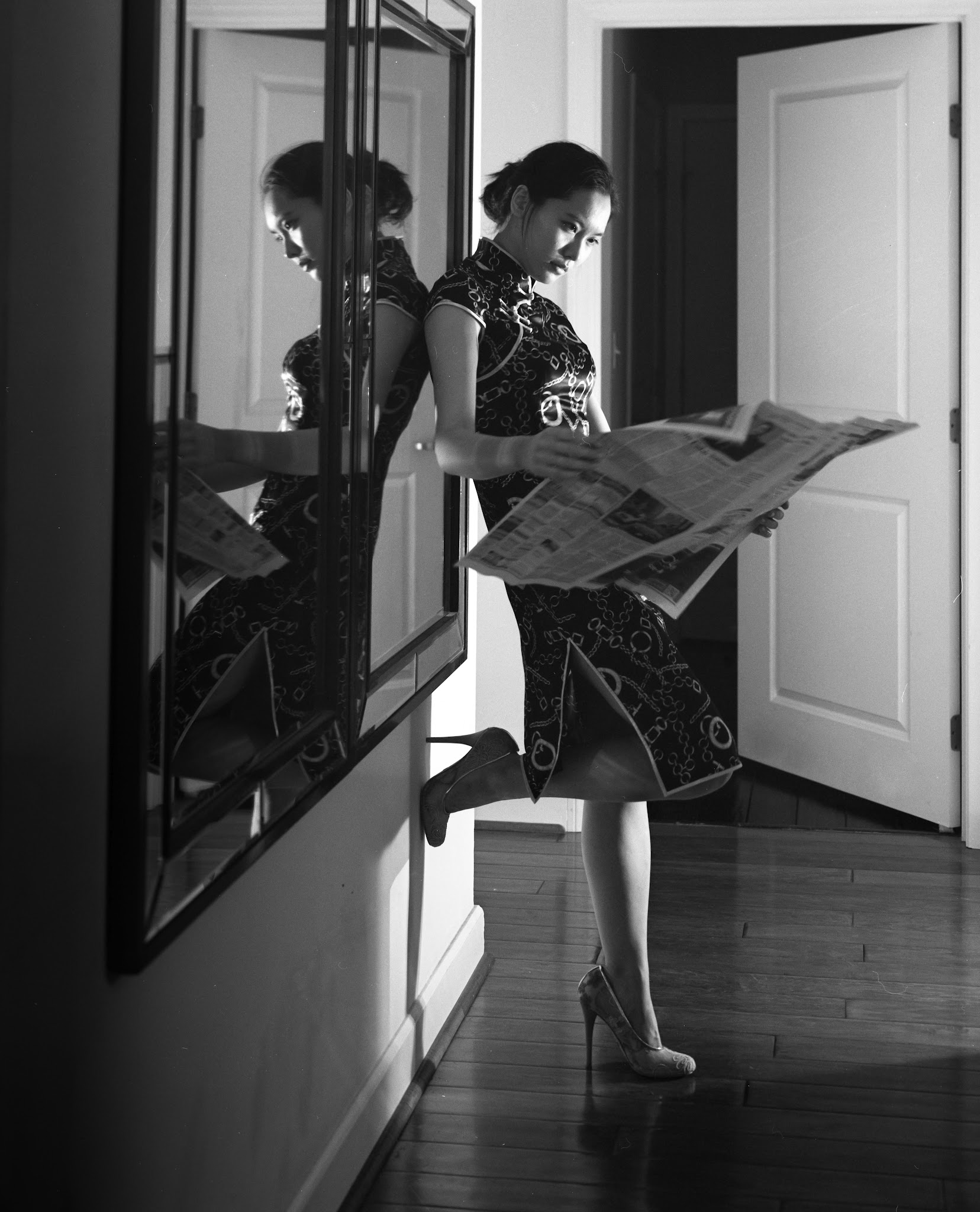 I shot this picture using a 4*5 view camera in my friend's apartment in palo alto. Having a storyline in my mind, I staged the scene, chose all the props, dressed my friend up, and directed her to pose for me. I tried to achieve a high control of details including the angle of how much the background door was open. Instead of using professional studio light gears, I managed to utilize all the available desk lamps, light torches, and white pillow cases instead. There is no built-in light meter in view cameras, and I use a separate light meter. I wanted to capture the details in black, hence rather than pointing at mid-gray, I first pointed the light meter at my model's hair (the blackest part) and then went 2 stops down so that the overall picture is not overexposed. I developed the TRIX320 films by myself and then scanned this negative into computer. Very minimum photoshop retouching was done (primarily about spotting and no editing on the light sources). I shot this picture with a small aperture and a 8 sec long exposure. I suggested my model to keep her body perfectly still yet slightly move her hand (so that there is an interesting twist in this picture: the newspaper is motion-blurred). | ||
