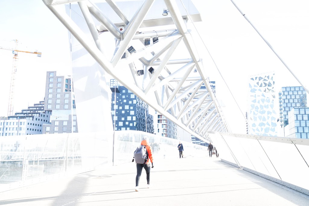 Bridge - Oslo, Norway, April 3rd. I saw a girl wearing a bright jacket crossing this bridge. I quickly lowered the f stop to blow out the sky, hoping it would make her jacket stand out. The photo was shot in RAW and contrasted/sharpened in Photoshop.
