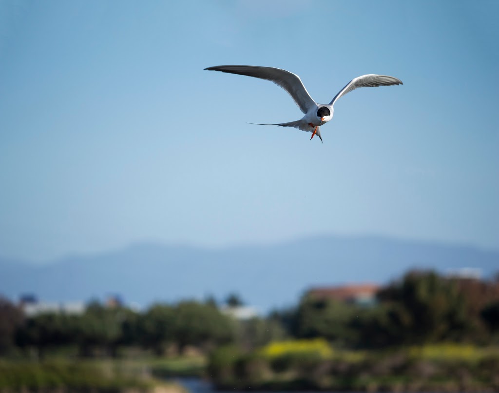 I also took this photo at Shoreline Park in Mountain View. This bird was swooping down to land in the lake. I like the sharp bird in the foreground against the out of focus building and trees in the background. I actually took this shot using shutter priority mode a 1/1250 s shutter speed and ISO 200. This resulted in an aperture of f/5.6. After taking the photo, I used Adobe Camera Raw to adjust the white balance, increase the contrast, increase the clarity/local contrast, increase the saturation, and remove lateral chromatic aberration. Additionally, because the bird was moving around quite quickly, it was quite close to the top of the frame in the original photo, which made the composition a bit awkward. I used Photoshop to add some more blue sky above the bird with content-aware fill. This technique worked well since the sky was a fairly uniform color and did not contain any fine details. The resolution of this image is actually larger than the photo straight out of my camera. | ||