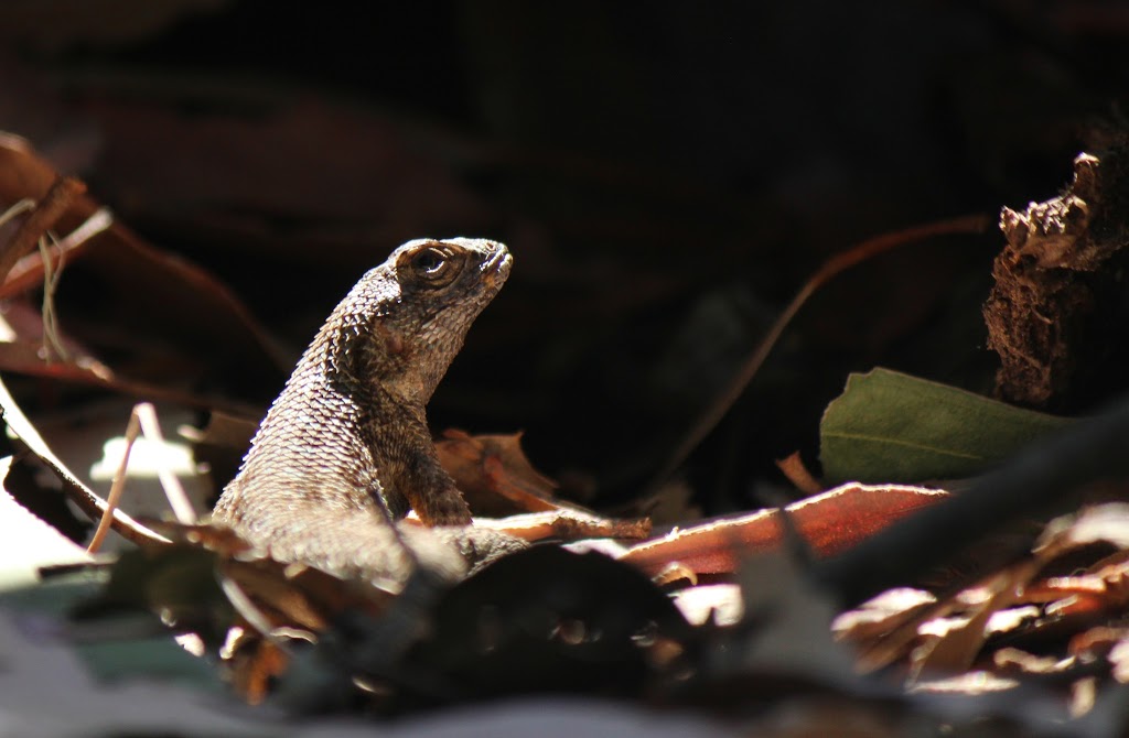 The dry leaves in the foreground and the background make this a comfortable nest for a lizard. They're darkened and blurred out to frame and accentuate the lighted object in the shot, the lizard. The lizard is looking up at the sun and appears wishful. | ||