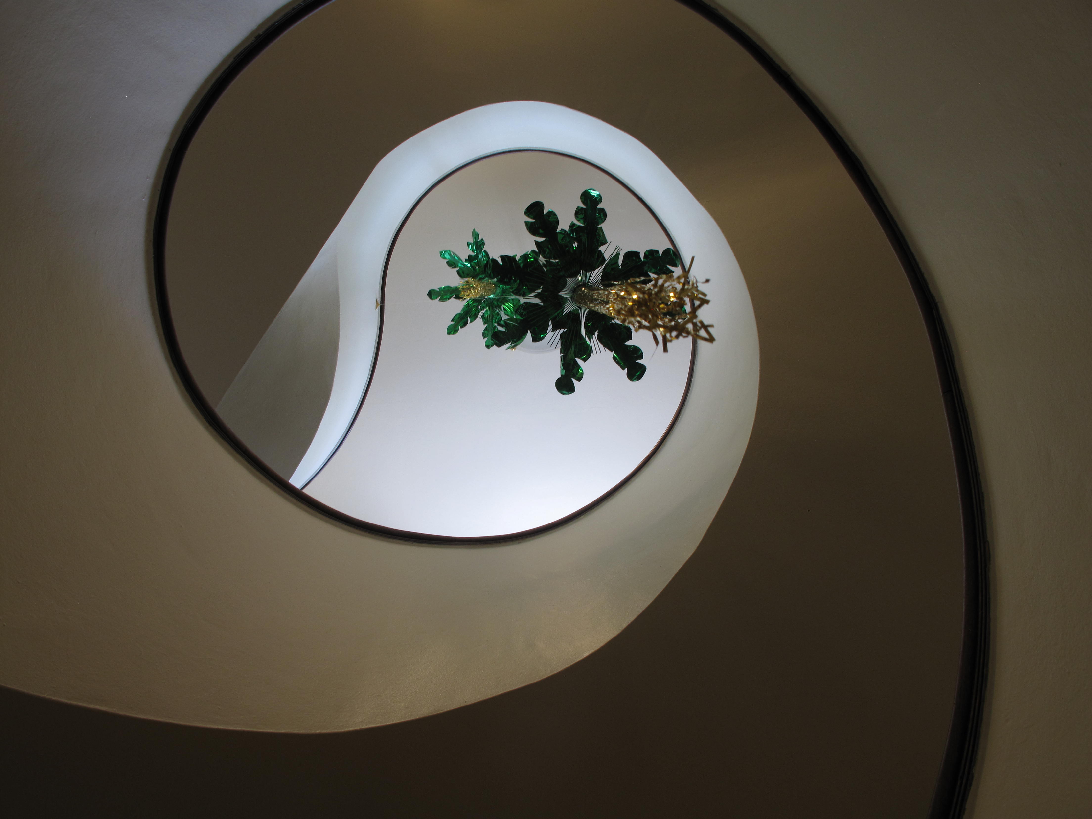 Looking up through the middle of the spiral staircase in Haus Mitt at the hanging tinsel palm trees. I tried to focus on the bottom fringe of the gold tinsel. I loved the imperfect spiral and the different light values on each of the surfaces. It was fairly dark and I had to mess around with metering to capture those values without blowing out the brightness near the ceiling. | ||