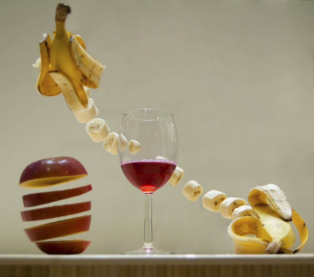 I setup this scene by building small stage that I could tie wire to which would be able to hold the fruit pieces (see Setup 1). I then put a piece of foam core in the background to achieve a white background so that the focus would be on the fruit and wine. I chose to light it from above because that had the coolest effect on the wine (glowing bottom). I also chose to align the fruit in this manner so it would frame the wine glass.