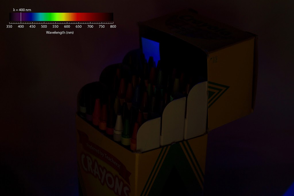 One other important note: the photos at 400 nm and 700 nm look very dim, but close to normal (i.e. white light) coloration. The intensity of the illumination under these conditions was definitely sufficient to be detected by my eye, but I think these wavelengths are not detected by the camera's sensor. The reason that the crayons appear dim but normal colored is that there was some stray light that leaked into this setup from the room. We have a black shroud that prevents outside light from leaking into the system during our measurements, but I couldn't fully enclose the system in the shroud without blocking the camera, so some ambient light leaked in. If I were to do this experiment again, I would design a better light blocking system to make sure that the monochromatic light was always the only important light source.