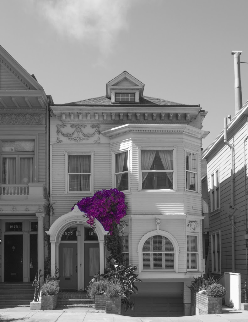 This photo was taken of a house in San Francisco. I saw the bright purple flower which contrasted against the relatively non-vibrant paint on the house, and though that it would be good effect to further accentuate. The image was shot in aperture priority mode with F/5.0, ISO 100 and a camera-selected shutter speed of 1/250s. ISO 100 was chosen to minimize noise, and the choice of aperture was not very important to this photo. Using Photoshop, I converted from RAW an created a layer mask to desaturate all of the image except for the purple flowers. I made several other minor adjustments including adjusting exposure and using lens correction to remove keystoning of the house.