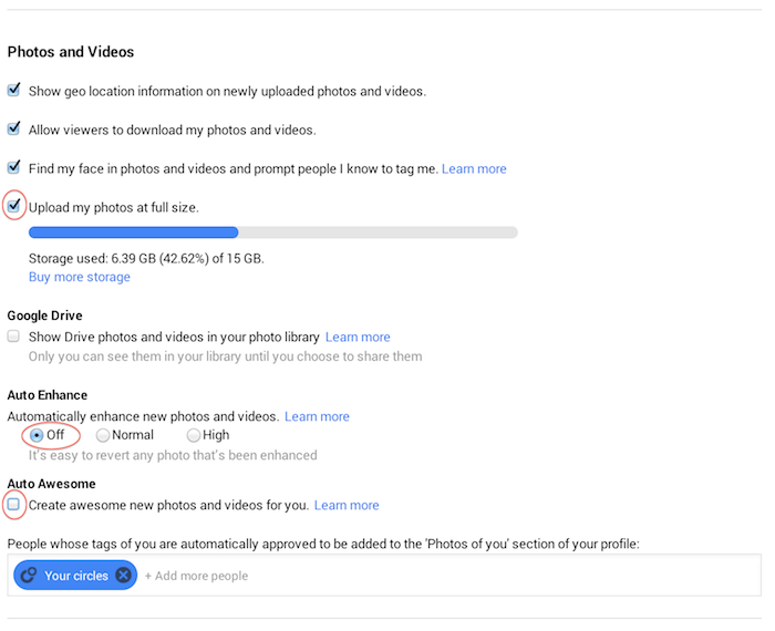 Setting up your Google AccountYou will need a Google account to submit assignments for this course. You can use an existing @gmail.com account or create a new one. Unfortunately, you will not be able to use your @stanford.edu Google account because you will not be able to disable certain settings. Most students already have an @gmail.com Google account and choose to use this account. However, you will be creating public albums for this course, which will show up on your Google+ feed. You will also need to disable certain settings that you may want if you also use Google+ for your personal photos. So, you might consider creating a new account for this course if either bothers you. Creating a New AccountIf you need to create a new account, you can do so here: https://accounts.google.com/SignUp Configuring your Account for CS178Google automatically manipulates the photos that you upload. These enhancements include contrast, saturation, sharpness, and other factors. Sometimes these changes look good; sometimes they don't. However, as students in a photography class, you don't want Google doing photographic enhancement for you. Unfortunately, Google turned on Auto-Enhance for the entire world by default. While this may sound great, it will mean that the hard work you spend taking and editing your photos will be incorrectly manipulated by Google. We want to see (and grade) your photographs, not a collaboration between you and a Google algorithm. To disable these features, navigate to your Google+ account settings: https://plus.google.com/settings Scroll down to the Photos and Videos section and make the following changes: