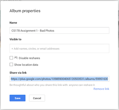 Then, click "Share via Link". You can add and delete photos from this album while you are working on it. But, you should finish uploading and fix the order of your album before submitting it on the peer grading system. Uploading using PicasaYou can also use the Picasa web interface or desktop software, just make sure that the visibility is set to Public and that the files are uploaded with the image size is Original Size. The rest of the details are up to you. Writing Descriptions for Each PhotoYou will need to write a description for each photo in your assignment. The description should explain how you took the photo, what relevant camera settings you used and why, and any image processing done to the photograph afterwards. Your comments aren't required to go into quite as much detail as the example solutions (found on each assignment page), but if you don't add a description to each photo, you won't receive any credit for the assignment. We strongly recommend that you write a description for each for photo in a text document using the editor of your choice (e.g. Google Docs, Notepad, Microsoft Word, TextEdit, vim, etc.), which you save regularly. Uploading Assignment to VelaOnce you have uploaded your photos to a Google+ Album, you will need to submit your assignment on the peer grading system: http://vela.stanford.edu. Log in Vela using the same Google account that you used to create the album. It is important that you use the same Google account for the duration of the course. To submit your assignment, click the "Submit Assignment" button on your home page. Select the assignment you would like to submit in the first drop down, and your Google+ album for this assignment from the second drop down. It is important that all of your photos for a particular assignment are in the album, and that the album contains no extra photos. The system will take the first 10 photos from the album that you select. Once you have uploaded your assignment to the peer grading system, you will need to select a requirment and add your description (see the previous section) for each photo. When you have selected at least one photo for each requirement and added descriptions, you will see the boxes checked in the table. If you have not added a requirement or description to a photo, you will see a yellow warning sign on the thumbnail of the image on the left. FAQWhat if I want to change a photo?First, make sure that your descriptions are saved to a text document. Then, click "Delete Assignment" on the page that shows the assignment. Follow the instructions above to reupload it. How do I take a late day?You may use up to two late days per assignment as per the course outline (four may be used without penalty in total). The requirement or description of a photo can be updated at any time before the late deadline, but you will automatically be charged late days for updates made after the deadline. What if I need more than two late days for one assignment?If you submit the assignment more than two days late, it will not be peer reviewed, and your score will be reduced as prescribed in the course outline. © 2009-2014 Marc Levoy, Andrew Adams, and Jesse Levinson |