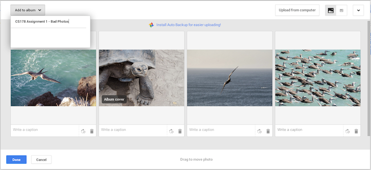 If you want to see what Auto-Enhance does, feel free to turn it on and upload some photographs. If you hover over a photograph you own, you can flip back and forth between the enhanced and original versions. In fact, maybe we can talk about Google's enhancements in class during the lecture on post-processing, but make sure the feature is off when you upload assignments for this course. Uploading Your Assignments to Google+There are at least three ways to upload your assignments. You can read through the three methods and decide to use whichever you prefer. In each case, you will need to create an album; the name isn't particularly important, but you will need to remember it for the next step. We recommend using "CS178 Assignment 1 - Bad Photos" for the first assignment, and using a similar variation for each subsequent assignment. Each photograph you upload should meet at least one of the requirements for the assignment, and you should make sure to cover every requirement with at least one photo. You should upload at least five photographs for the assignment, but no more than ten. While a photo can fulfill more than one requirement, you will need to select exactly one requirement for each photo, which will be used for grading. Uploading using Google+Start on the Google+ Photos page: https://plus.google.com/photos Click the "Upload Photos" on the menu bar.