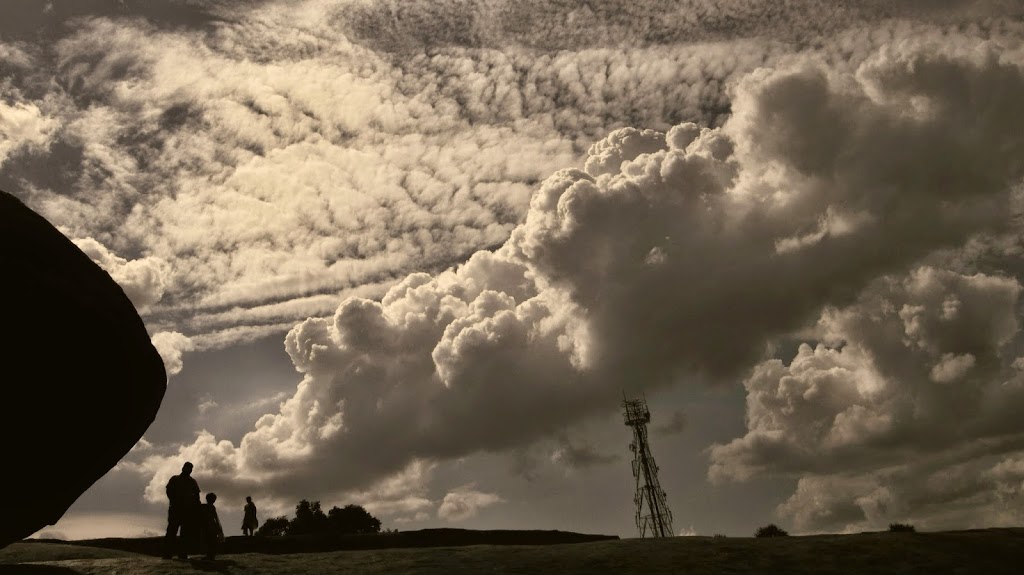 One of the two pictures in this set taken with my portable travel camera. Taken around 7:30 PM. The sunlight is pouring down right from the west, slightly above the horizon, casting the human figures and the installation as dark shadows (so it's essentially the cloud blocking the grazing sunlight). It was instead grazing the surface of the cloud which was slanting down westward. I like how something's weird about this photo (it might be the tower in the back "supporting" the cloud sliding down), so I kept the huge installationshadow on the left as it was. This was taken at the foot of a hill, so I adjusted the horizon slightly so that it's flattened as opposed to curved. This could have been a texture photo as well. | ||