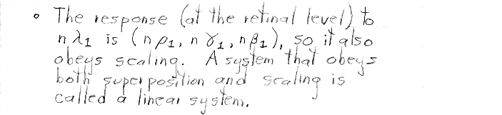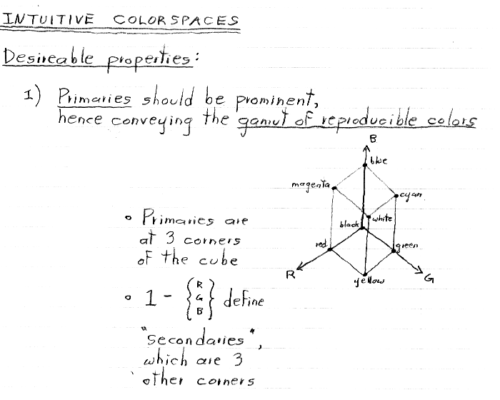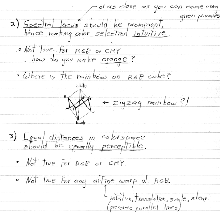 The rho-gamma-beta response space we have been considering so far represents mixtures of primaries whose sum is no greater than one. In the RGB cube diagrammed immediately above, setting two or three guns to full amplitude (value=255) violates this assumption. Thus, to visualize this cube plotted in rho-gamma-beta space, you must lower the light output corresponding to the R=255, G=255, and B=255 points in the RGB cube until the white point (R=G=B=255) falls within the convex hull of the spectral locus.