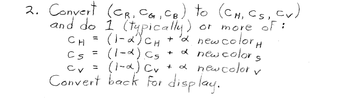 Option 2 might be called "interpolation in HSV space." Since straight lines in RGB space are not straight in an HSV space, interpolating in HSV produces a different effect than interpolating in RGB. The exact difference depends on which HSV space is chosen. For example, linearly interpolating halfway from pure red, which is (R,G,B) = (255,0,0) (assuming 8-bit values), to pure green, which is (0,255,0), yields (128,128,0), which is a dark yellow. Using the single-hexcone HSV space described in section 13.3.4 of the textbook, pure red is (H,S,V) = (0o,1,1), and pure green is (120o,1,1). Interpolating halfway between them yields (60o,1,1), or (255,255,0) in RGB space, which is pure yellow. This is the interpolation method we are asking you to implement in project #2.
