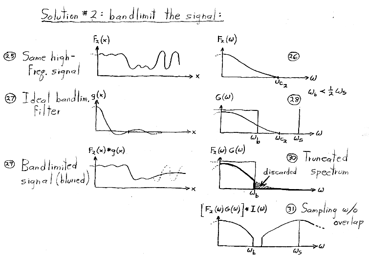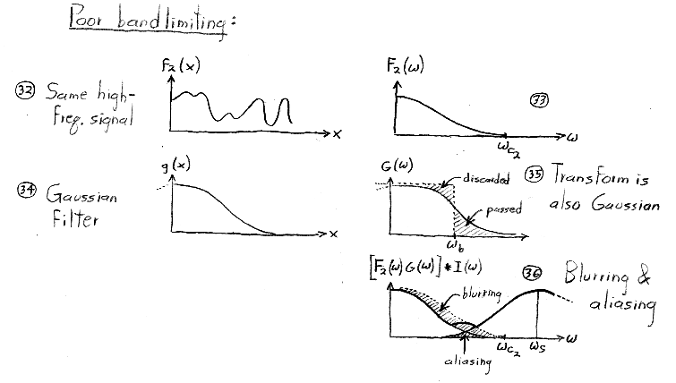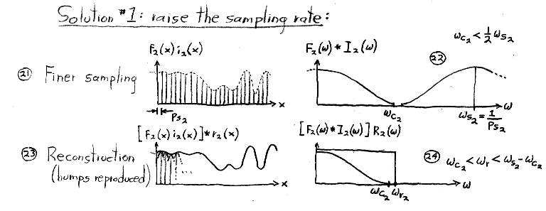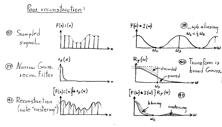 Although we do not manipulate impulses or impulse trains algebraically in this course, you might be wondering how they are defined. The single impulse function, dirac-delta(x), is defined as the limit of a rect function as its width goes to zero. It is drawn as a single upwards-pointing arrow of unit height located at x = 0. (The rect function, you may remember, has unit height, unit width, and is centered around x = 0.) The impulse does not have a value per se at x = 0, but is instead defined as having value = 0 for x <> 0 and integral (from negative to positive infinity) = 1. The impulse train, a.k.a. shah(x), is defined as a sum of shifted impulses. Its Fourier transform, surprisingly, is also an impulse train, where the impulses are spaced as shown above. If you're interested in more details on rects, impulses, impulse trains, and their Fourier transforms, look at the notes from CS 348B at http://graphics.stanford.edu/courses/cs348b-98/sampling/sampling1.html#Impulse Function.