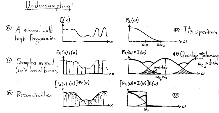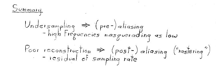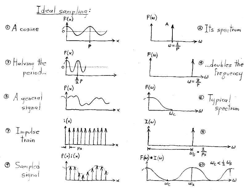Although we do not manipulate impulses or impulse trains algebraically in this course, you might be wondering how they are defined. The single impulse function, dirac-delta(x), is defined as the limit of a rect function as its width goes to zero. It is drawn as a single upwards-pointing arrow of unit height located at x = 0. (The rect function, you may remember, has unit height, unit width, and is centered around x = 0.) The impulse does not have a value per se at x = 0, but is instead defined as having value = 0 for x <> 0 and integral (from negative to positive infinity) = 1. The impulse train, a.k.a. shah(x), is defined as a sum of shifted impulses. Its Fourier transform, surprisingly, is also an impulse train, where the impulses are spaced as shown above. If you're interested in more details on rects, impulses, impulse trains, and their Fourier transforms, look at the notes from CS 348B at http://graphics.stanford.edu/courses/cs348b-98/sampling/sampling1.html#Impulse Function.