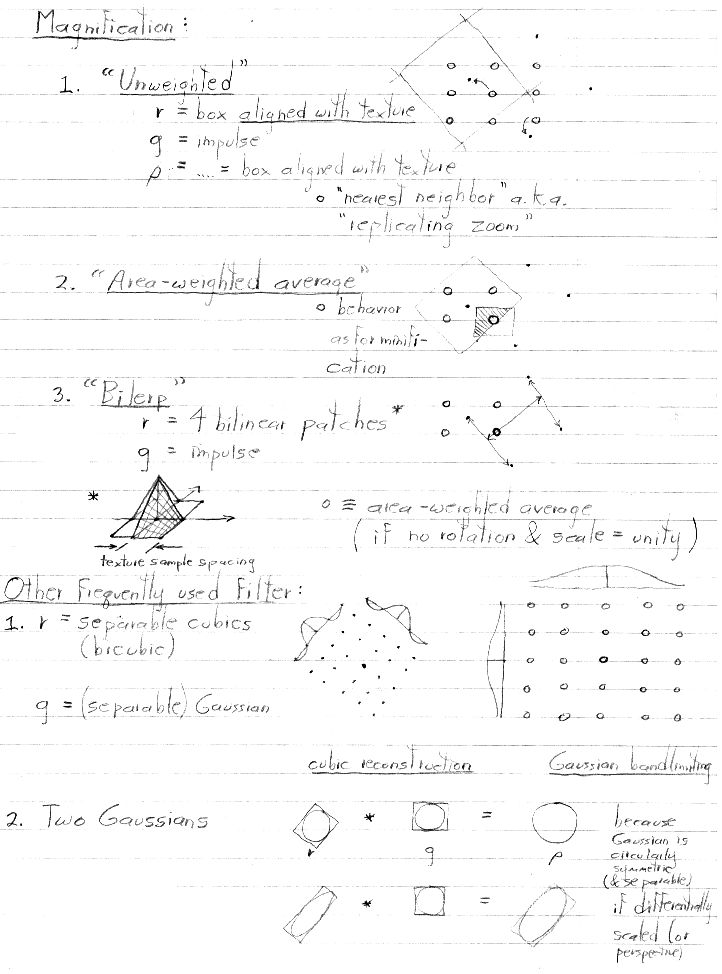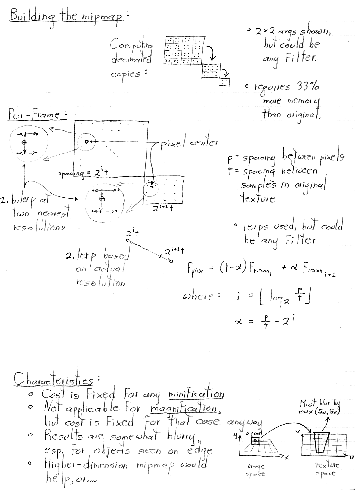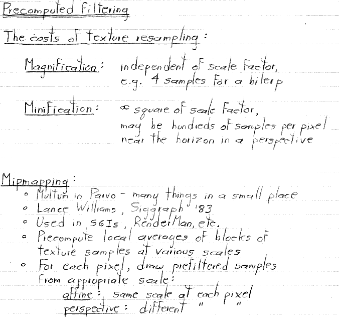 I didn't have time to cover these other filters in class. There is some discussion of them in Paul Heckbert's article, which I handed out. If you're interested in reading more about texture mapping and filters, Heckbert's Master's thesis (available from his home page, makes excellent reading.