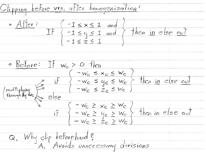 One further complication. When a polygon is clipped to the viewing frustum (a process we'll learn about shortly), vertices that are outside the frustum are discarded, typically to be replaced by new vertices that lie on the frustum boundaries. When this happens, the new vertices must be given normals, texture coordinates, and colors. This is done by interpolating these values from the vertices lying on either side of the frustum boundaries. This interpolation occurs before homogenization, so simple linear interpolation is used.