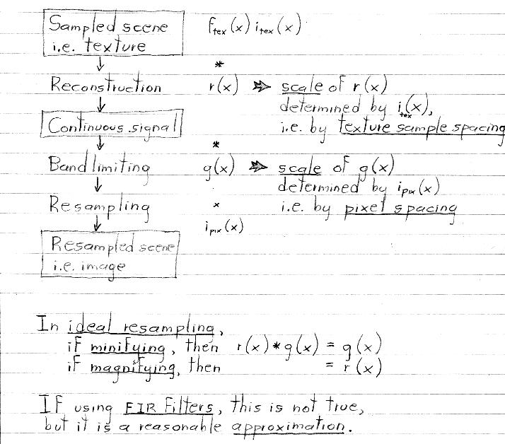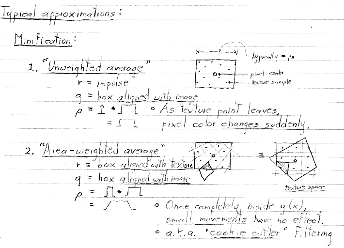 I didn't cover these other filters in class, and I won't hold you responsible for them. There is some discussion of them in Paul Heckbert's article, which I handed out. If you're interested in reading more about texture mapping and filters, Heckbert's Master's thesis (available from his home page) makes excellent reading.