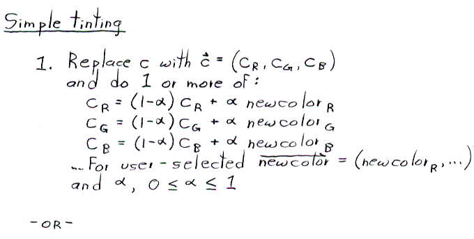 Option 2 might be called "interpolation in HSV space." Since straight lines in RGB space are not straight in an HSV space, interpolating in HSV produces a different effect than interpolating in RGB. The exact difference depends on which HSV space is chosen. For example, linearly interpolating halfway from pure red, which is (R,G,B) = (255,0,0) (assuming 8-bit values), to pure green, which is (0,255,0), yields (128,128,0), which is a dark yellow. Using the single-hexcone HSV space described in section 13.3.4 of the textbook, pure red is (H,S,V) = (0o,1,1), and pure green is (120o,1,1). Interpolating halfway between them yields (60o,1,1), or (255,255,0) in RGB space, which is pure yellow. This is the interpolation method we are asking you to implement in project #1.