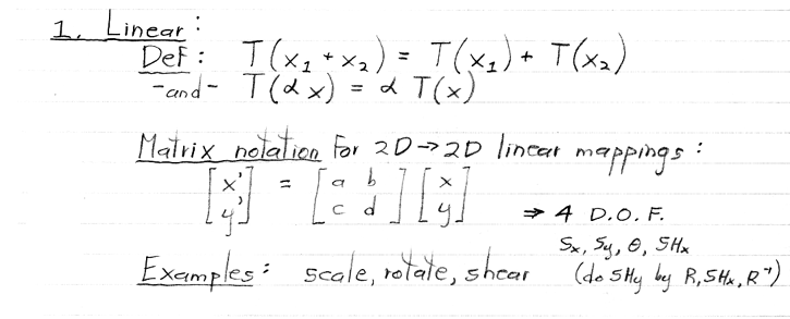 In other words, linear mappings in 2D are those that can be accomplished using a 2 x 2 matrix multiplication with the coordinates (not raised to any power) as inputs.
