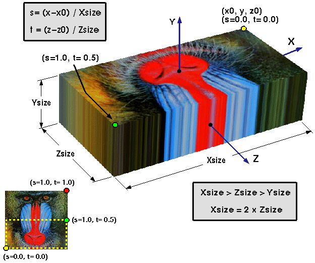 Textures are applied individually to each face of the box; the entire untransformed texture goes on each face. On the front, back, right, and left faces of the box, when viewed from the outside with the Y-axis up, the texture is mapped onto each face with the same orientation as the if image was displayed in normally 2D. On the top face of the box, when viewed from the outside along the +Y axis looking down with the -Z axis as the view up direction, the texture is mapped onto the face with the same orientation as if the image were displayed normally in 2D. On the bottom face of the box, when viewed from the outside along the -Y axis looking up with the +Z axis as the view up direction, the texture is mapped onto the face with the same orientation as if the image were displayed normally in 2D. TextureTransform affects the texture coordinates of the Box.