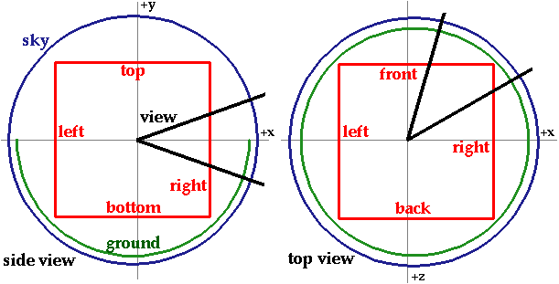 The backUrl, bottomUrl, frontUrl, leftUrl, rightUrl, and topUrl fields specify a set of images that define a background panorama, between the ground/sky backdrop and the world's geometry. The panorama consists of six images, each of which is mapped onto the faces of an infinitely large cube centered in the local coordinate system. The images are applied individually to each face of the cube; the entire image goes on each face. On the front, back, right, and left faces of the cube, when viewed from the inside with the Y-axis up, the texture is mapped onto each face with the same orientation as the if image was displayed normally in 2D. On the top face of the cube, when viewed from the inside looking up along the +Y axis with the +Z axis as the view up direction, the texture is mapped onto the face with the same orientation as the if image was displayed normally in 2D. On the bottom face of the box, when viewed from the inside down the -Y axis with the -Z axis as the view up direction, the texture is mapped onto the face with the same orientation as the if image was displayed normally in 2D.