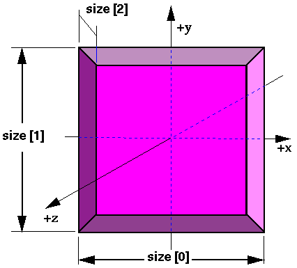 The Box node specifies a rectangular parallelepiped box in the local coordinate system centered at (0,0,0) in the local coordinate system and aligned with the coordinate axes. By default, the box measures 2 units in each dimension, from -1 to +1. The Box's size field specifies the extents of the the box along the X, Y, and Z axes respectively and must be greater than 0.0.