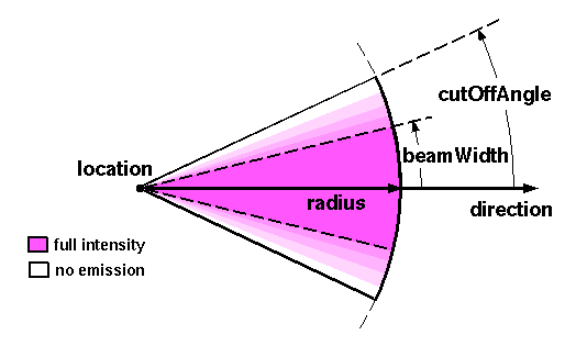 The skyColor field specifies the color of the sky at the various angles on the sky sphere. The first value of the skyColor field specifies the color of the sky at 0.0 degrees, the north pole (i.e. straight up from the viewer). The skyAngle field specifies the angles from the north pole in which concentric circles of color appear - the north pole of the sphere is implicitly defined to be 0.0 degrees, the natural horizon at pi/2 radians, and the south pole is pi radians. skyAngle is restricted to increasing values in the range 0.0 to pi. There must be one more skyColor value than there are skyAngle values - the first color value is the color at the north pole, which is not specified in the skyAngle field. If the last skyAngle is less than pi, then the color band between the last skyAngle and the south pole is clamped to the last skyColor. The sky color is linearly interpolated between the specified skyColor values.