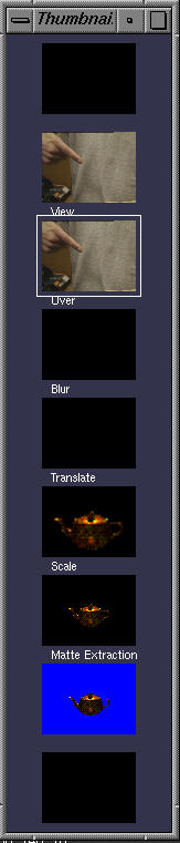 Using the first mouse button select some layer near the bottom of the thumbnail pipeline. (The white border indicates the currently active layer.) Then choose R-Open Movie menu option(where I'll use R- or M- to indicate whether something is on the right or middle menus). This puts a prompt in your console window, at which you can enter a file name. I've used teapot.mv. You should now have something similar to the frame below.