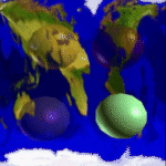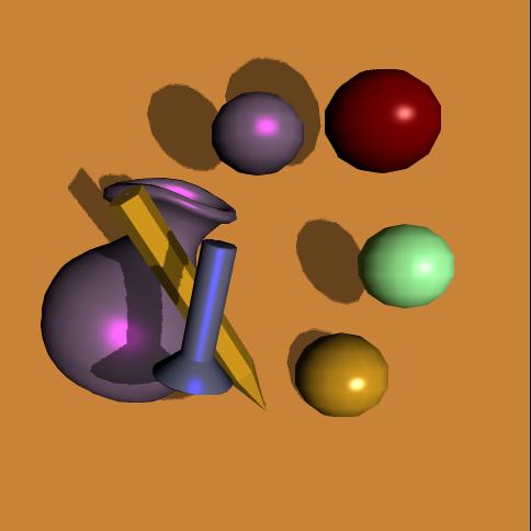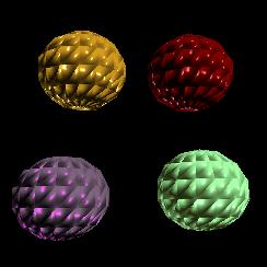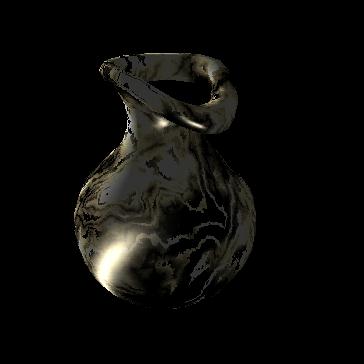 These stills illustrate effective use of texture mapping. In the first one, a very realistic bump map is applied onto the spheres, while in the second one, a procedurally generated marble texture is applied onto a vase. Lighting is also used very effectively.