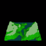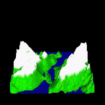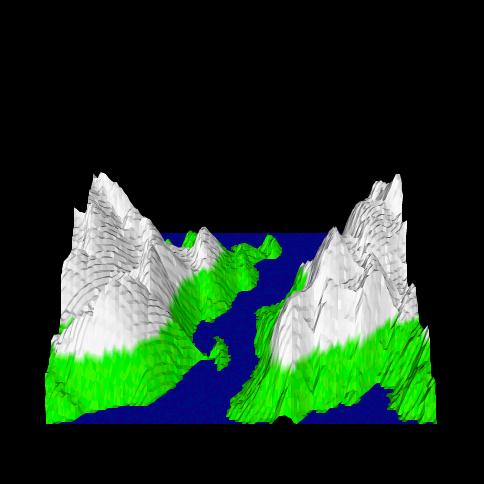 These stills illustrate the ability of Bryan and Vui Chiap's renderer to generate shadows. The second still is not part of their last movie (see below), although the procedurally modeled terrain is the same; the difference lies in the absence of shadows in the movie frames (compare this still to the movie's frame 25). The terrain color is based on the elevation of individual terrain features.