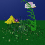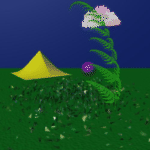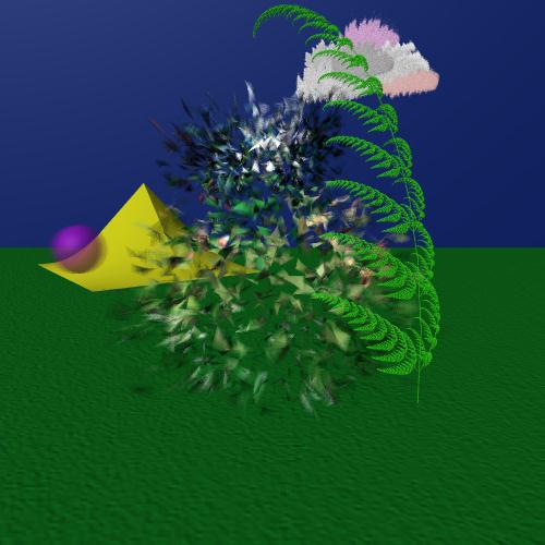 Gunnar used his custom animation system to generate this movie. The exploding vase is modeled as a particle system. The fern is procedurally modeled, and so is the cloud in the background. A bump map is applied on the planar floor to simulate the appearance of grass, while a color texture map is applied onto the vase (and sticks onto the shards as the vase explodes). Individual frames are motion-blurred (see frame 11 for example). Realism is added by the appearance of collision detection between the vase shards and the floor (implemented as a simple one-coordinate test) and the fern's hand-crafted bouncing after the red ball is dropped into the vase.