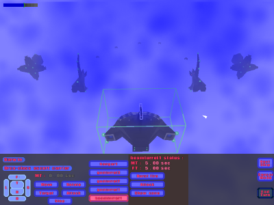 Up to four players can take part in the hotseat turn-based game. Your fleet consists of 2 battle frigates, 2 beam frigates, and an escort carrier carrying 5 squadrons of light fighters. Find your enemies' fleets, and destroy them to win. Your ships have full 3D movement, with independently operatable turrets and weapons systems. The nebula brings its own challenges: Your ships' sensors have limited range, and the thicker the nebula, the less they can see. Line-of-sight is realistically calculated, and ships have varying sensor signatures, and sensor effectiveness ratings. A separate sensor view allows for long-distance viewing of the map, and allows the player to see the current sensor envelope of the selected ship. The control system is similar to Homeworld and most RTS games.