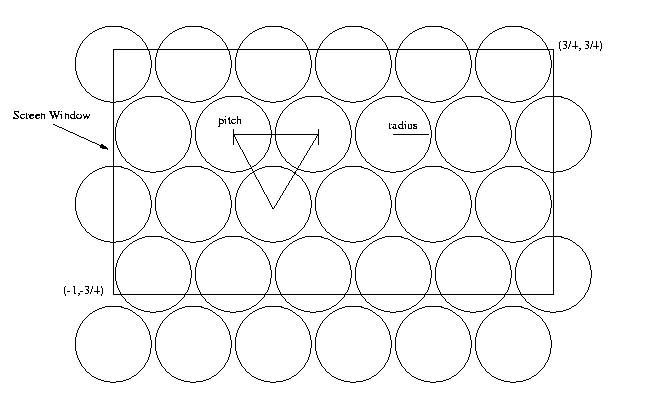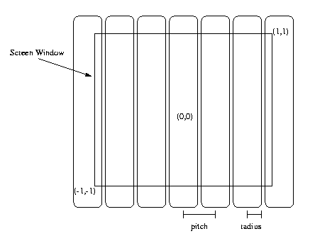 We can assume the lens system is large enough to cover the screen coordinate space. The combination of specifying an image size (say 200 by 200 pixels) and the ScreenWindow (say the default) tells us how many pixels are covered by each lens element. You will have to set the screen window appropriately to get a desired number of pixels per lens element. Be careful when you do this, however. When you change your ScreenWindow parameter, keep the aspect ratio the same as your specified image aspect ratio, or you'll get weird results.