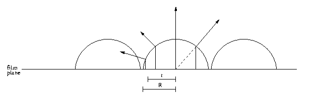Notice from figure 3 that some rays will hit neighboring lens elements. We won't have to trace these rays, as they will never be seen. The fov parameter can be used to calculate r < R (radius), which is the point where the rays bend into neighboring cells and don't need to be traced. The rays bend out from the lens as the normal at that point on the lens.