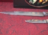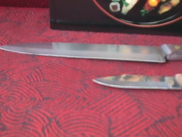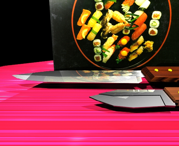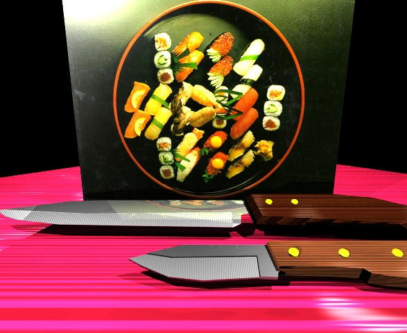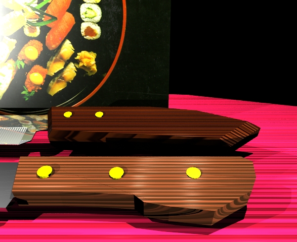 Alex implemented several different texturing techniques to render his knife scene. A procedural wood texture is used on the knife handles. The blades have a couple of different shaders applied to them. Both use procedural bump mapping to get realistic surface detail. The top part of the knife uses a scratch map, while the bottom uses a map of ridges.