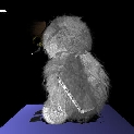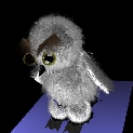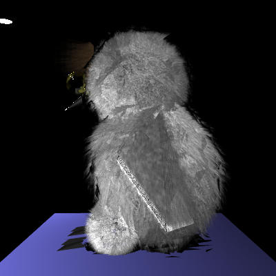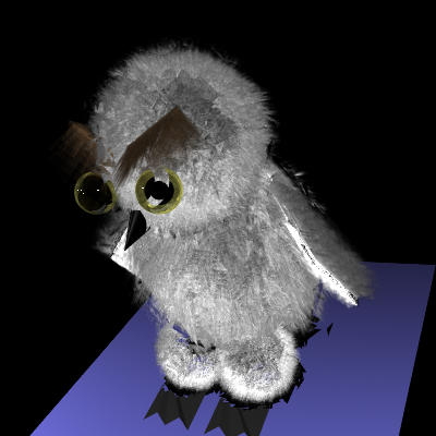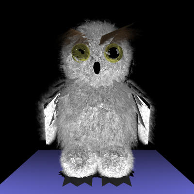 Andy made some very nice renderings of his stuffed owl, Missile instead of his pictured Manatee. He implemented a fur rendering algorithm to achieve the stuffed animal look. He added noise to the fur function to distribute it along the body in a more realistic manner. He also added a bias to the fur to make it point downward like it does on the stuffed animal.