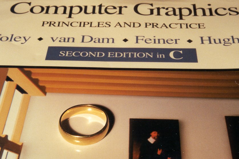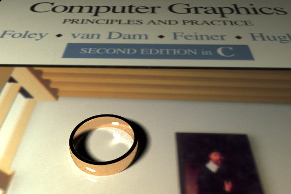 Duncan implemented a caustics photon map to capture the caustic produced by the ring on the surface of the book. Notice the nice cartoid shaped caustic on the inside of the ring boundary.