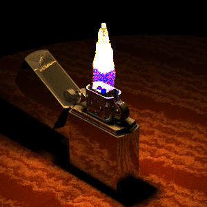 Greg and Yu Ping earned an honorable mention for thier excellent lighter scene. They implemented CSG, solid procedural texturing, bump mapping, plus some volume rendering techniques for the flame. The CSG allowed them to make a very convincing lighter model. The flame was treated as a volume light source, which was implemented in a manner similar to area light sources.