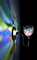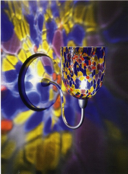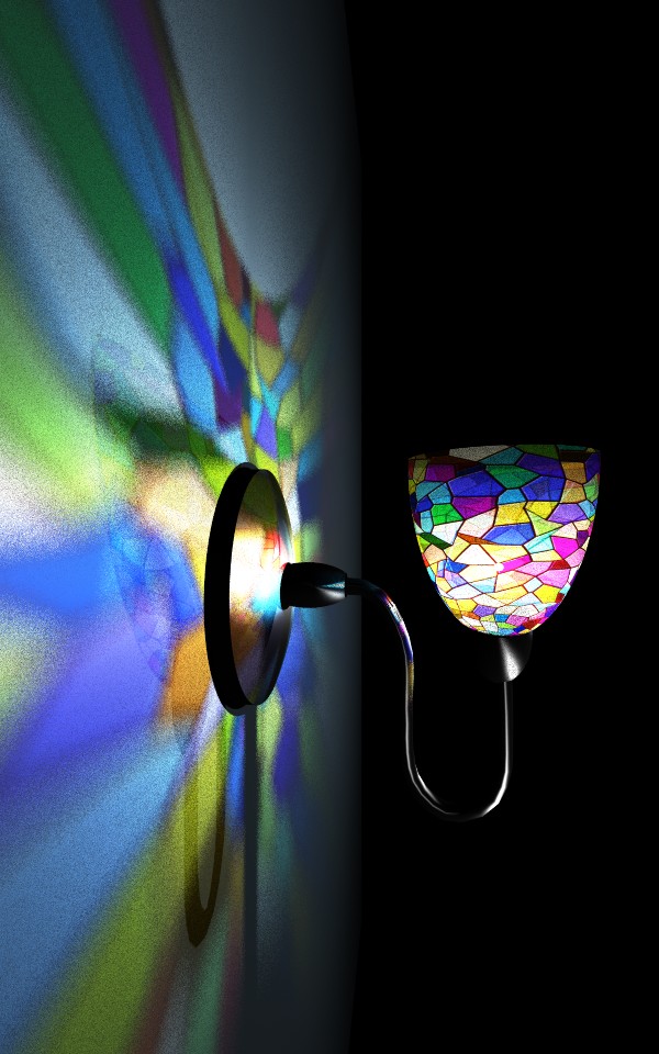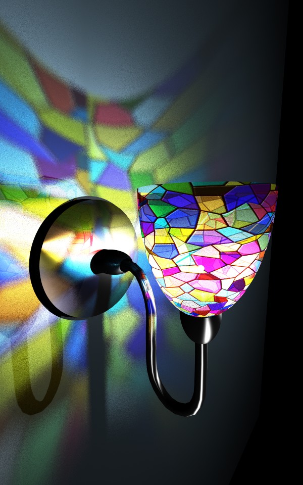 Gulli and Padma ended up rendering a wall sconce from a shop called "Delight" on Birch Street, Palo Alto. They added some transparency effects for the colored glass, and modeled the curvature of the arm using NURBs. The metal is anisotropic brushed metal.