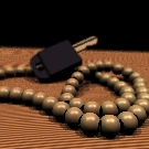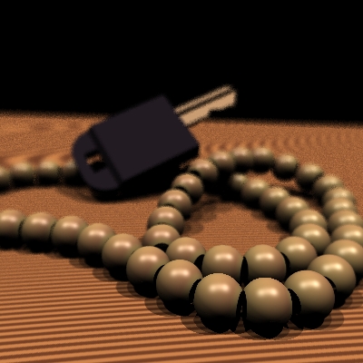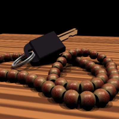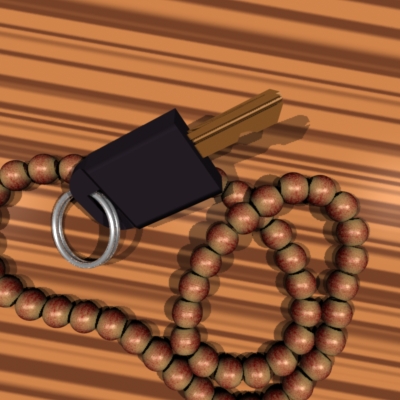 Hui put together a nice scene with his beads and key. He implemeted depth of field, Perlin noise, and a color surface shader. The noise gives the beads a nice change in color. He also added a 'round corner' shader to make the key have rounded edges with an underlying box model.