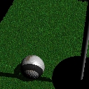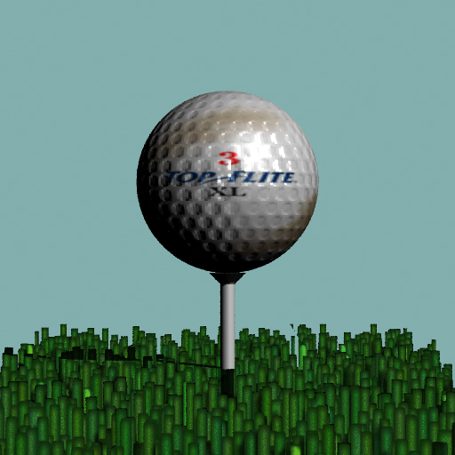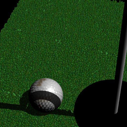 Jim rendered these golf scenes using texels for the grass. A detailed grass model would be far too expensive to compute, so he wanted to see the effects of applying a fur rendering algorithm to grass. He also bump mapped the golf ball, and added the dirt to the label texture to give it a more nautral look and feel.