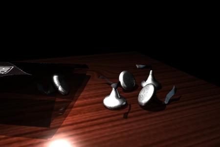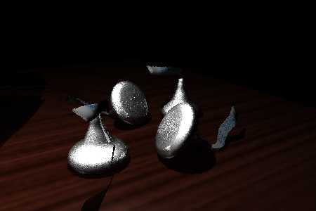 Matt rendered some Hershey's Kisses for his project. The foil look was generated using a bumpmap generated from a scanned wrapper. He also added decal texturing for the bag of kisses on the table.