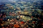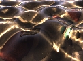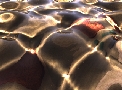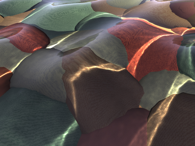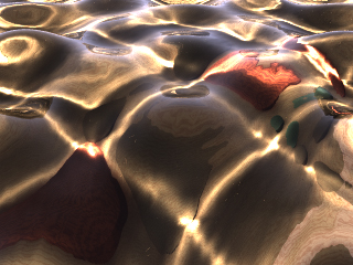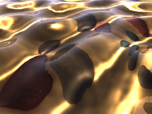 Ren and Prashant made some very nice renderings of the pond scene using photon maps. The photon mapping technique allowed them to capture the causitics on the rockbed caused by the ripples in the water surface. The rocks were textured using a Perlin noise function, and the water surface was created using a procedural language to allow the water surface to be specified as a sum of time-varying, circular and linear cosine waves.