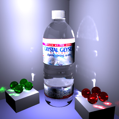 In addition to our implementation of photon mapping, other effects present in our scenes are bump mapping and texture mapping. Texture mapping was basically fully functional in LRT, but we did make good use of it by adding labels on the inside of the bottle with backward, lightened text and images to simulate being able to see through the other side of the labels. Bump mapping was used on the labels to simulate a nice wrinkled effect, and also on the cap to simulate the vertical grooves present in the original. To implement bump mapping we basically bind an image to a surface and use the RGB values as perturbed surface normal directions.